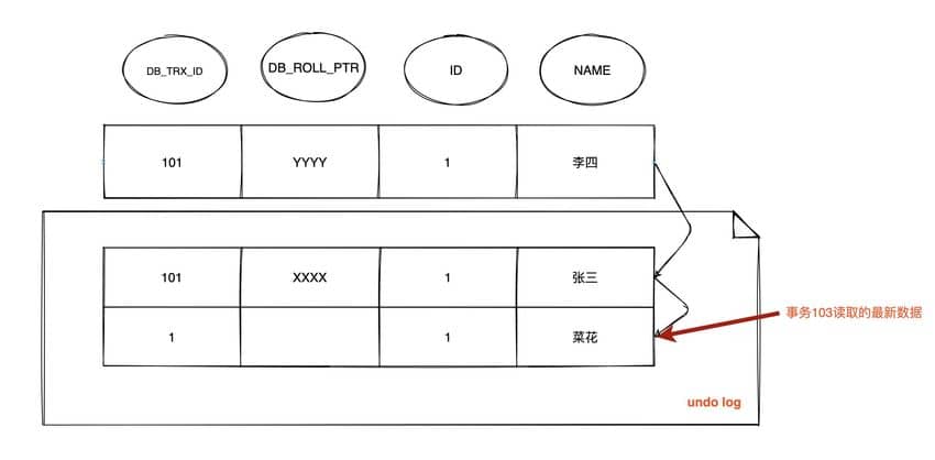 DB_ROLL_PTR找到undo log中的上一版本记录,上一条记录的DB_TRX_ID为 101,不可见继续根据