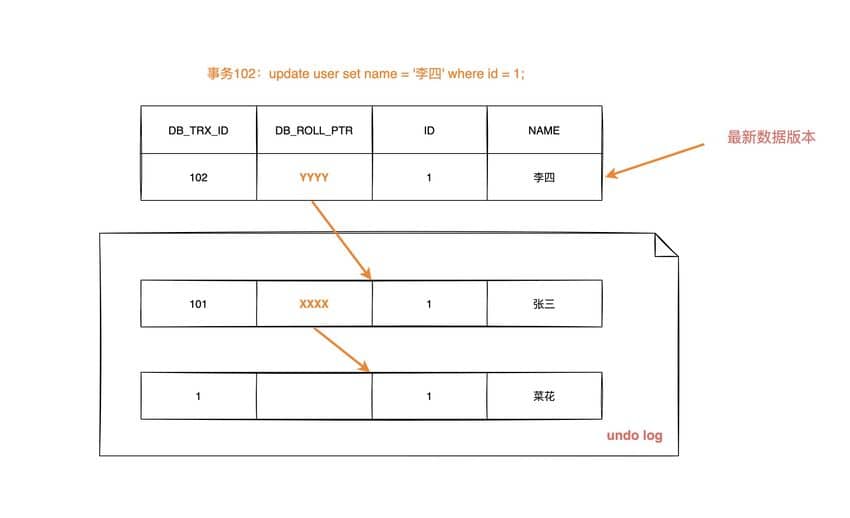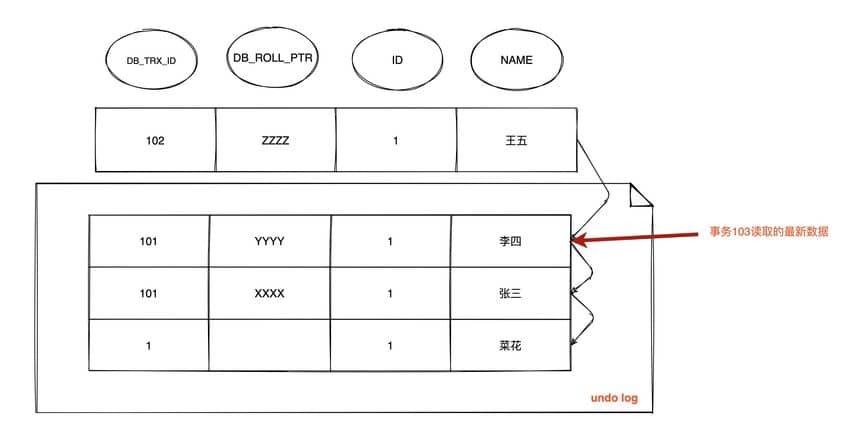 DB_ROLL_PTR找到undo log中的上一版本记录,上一条记录的DB_TRX_ID还是 101,不可见继续找上一条